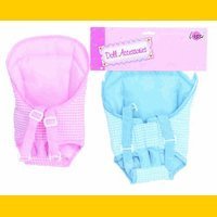 Baby doll fron doll carrier with adjustable straps holds up to a 21 doll Packed in a 17 x 10 bag with header Front doll carrier comes in pink or blue Adjustable strap to fit any size child Holds up to a 21 doll Read More..